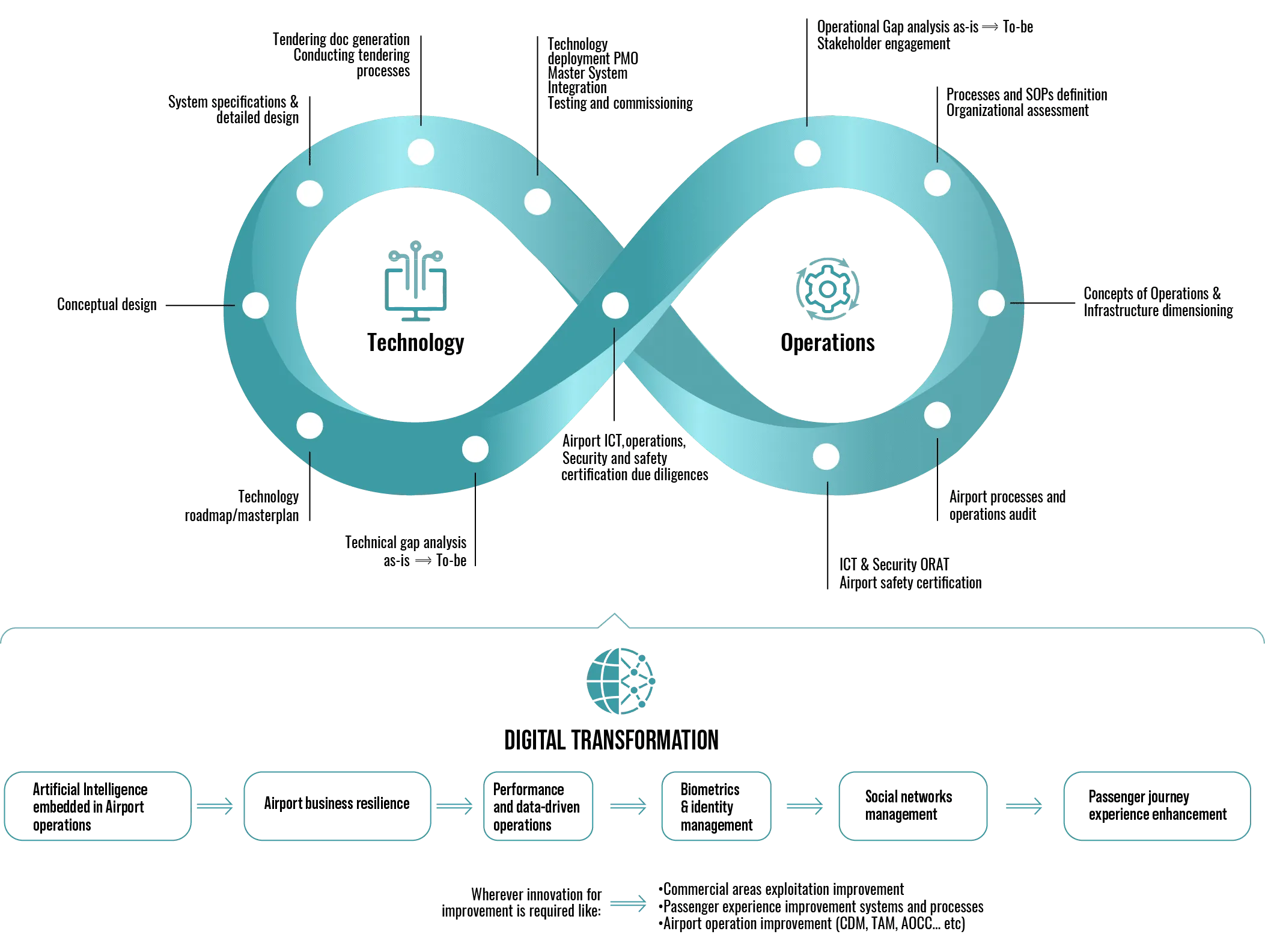 Due Diligence – Operational Feasibility assessments for technology implementation – Support on new digital processes/procedures implementation - Processes vs ICT analysis (gap analysis) - Automation Enhancement - Processes optimization - Processes digitalization - Data availability improvement, assessment and exploitation - Market surveys/benchmarking - Formal witness on Airport ICT and operations - Revenues enhancement – Innovation roadmaps elaboration (Single token/One-ID, Virtual queuing, passengers digital channels enhancement, passenger experience improvement… etc.) – Business continuity assurance